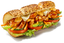 Chicken Teriyaki mit Schmelzkäse auf Cheese Oregano Brot mit Eisbergsalat, Tomaten, Gurken, Paprika, Karotten und Chipotle Southwest Soße.