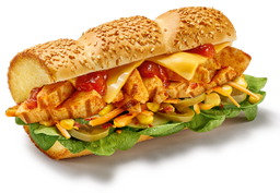 Würzige Salami, scharfe Peperonisalami und zarter Kochschinken mit geschmolzenem Mozzarella-Cheddar Mix auf Italian Brot mit Eisbergsalat, Tomaten, Gurken, Paprika, schwarzen Oliven und Hickory Smoked BBQ Soße.