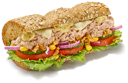 Thunfischcreme mit Schmelzkäse auf Honey Oat Brot mit Eisbergsalat, Tomaten, Gurken, roten Zwiebeln, Mais und Honey & Wholegrain Mustard Soße.