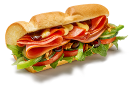 Würzige Salami, scharfe Peperonisalami und zarter Kochschinken mit geschmolzenem Mozzarella-Cheddar Mix auf Italian Brot mit Eisbergsalat, Tomaten, Gurken, Paprika, schwarzen Oliven und Hickory Smoked BBQ Soße.