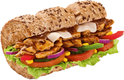Chicken Teriyaki mit Schmelzkäse auf Cheese Oregano Brot mit Eisbergsalat, Tomaten, Gurken, Paprika, Karotten und Chipotle Southwest Soße.